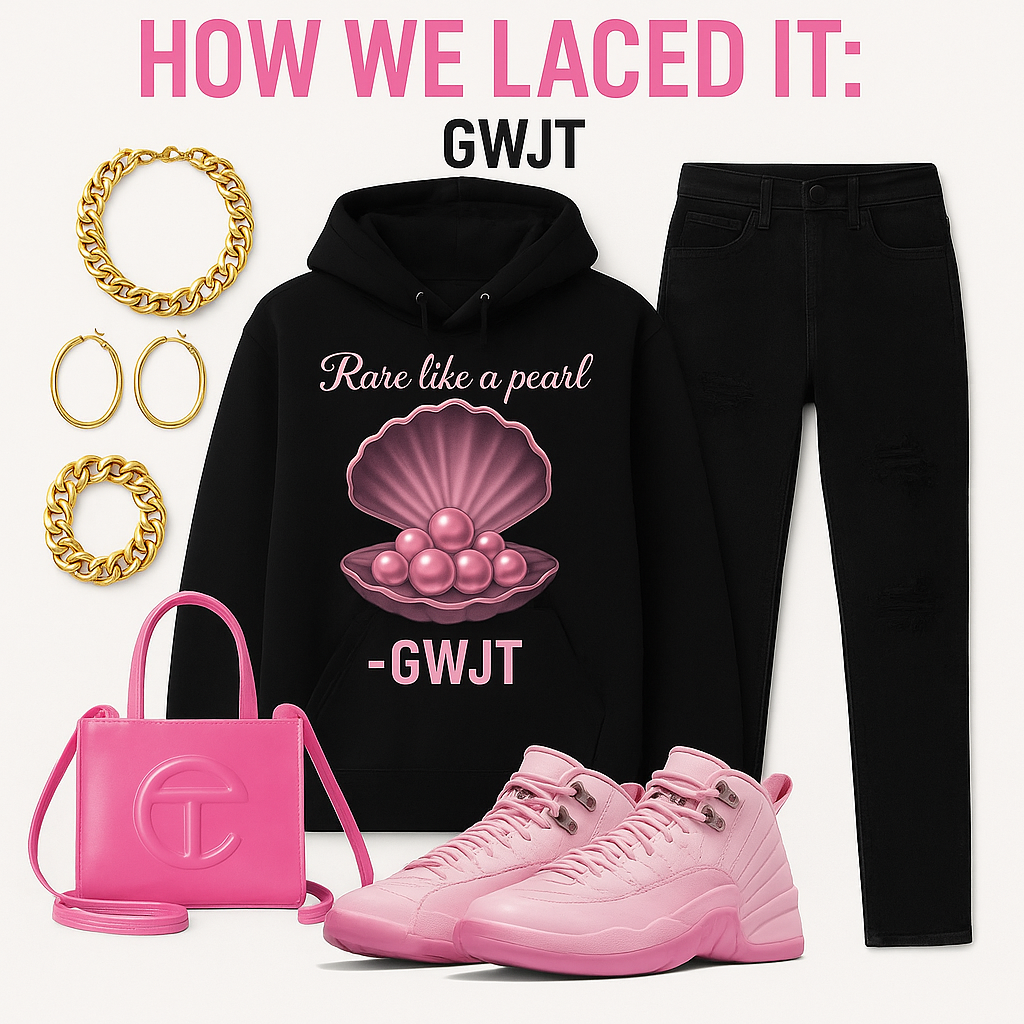 The Rare Like a Pearl Hoodie was made for the girls who know their worth and never settle for average. Designed by Girls Wear Jordans Too, this luxe piece pairs perfectly with your Pink Pearl 12s, bringing that soft-girl energy with a bold twist. The shimmering pearl graphic and script design remind everyone that confidence and femininity can coexist and when you rock Js, it’s always elegance with edge.